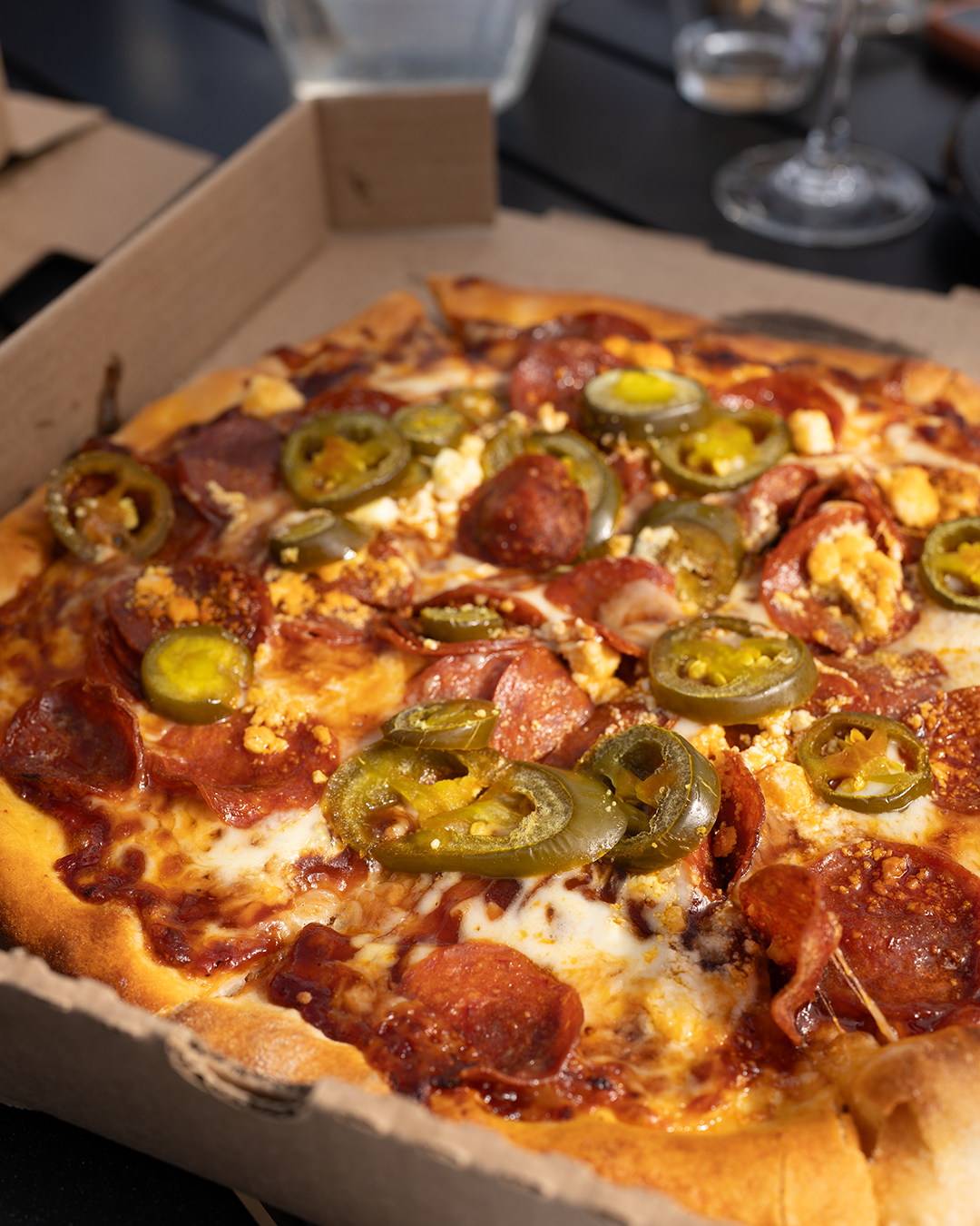 We tried the Cellar Club BBQ, made with BBQ sauce, spicy BBQ mozzarella, pepperoni, jalapeños, and goat cheese. The sweet and spicy balance was perfect, and the goat cheese added such a bold finish.