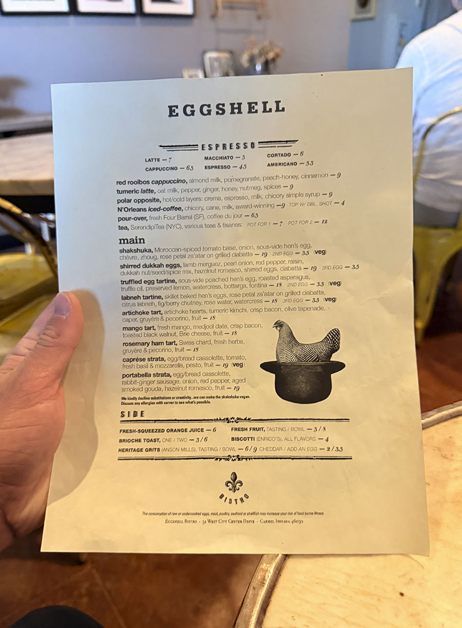 Eggshell Bistro is the perfect brunch escape — whether you’re a Carmel local or just passing through. Their Shakshuka is a must-try, the coffee is exceptional, and the atmosphere is unlike anything else in the area.