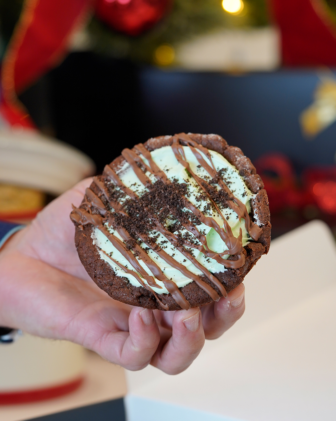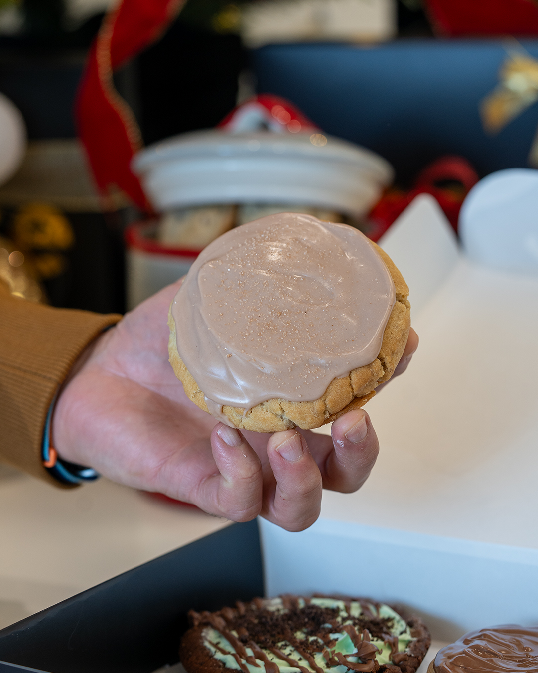 Things get richer with cookies like the Chocolate Turtle, a caramel-filled brown sugar cookie topped with candied pecans and milk chocolate, and the playful Grinch, made with chocolate sugar dough, mint frosting, chocolate drizzle, and crushed Oreo. Both bring that warm, cozy energy you want around the holidays — one through sweetness, the other through a fun minty twist.