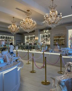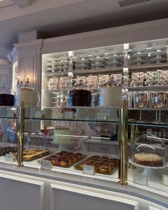 From the moment you step inside, it feels like you’ve been transported into a whimsical wonderland. Every inch of the space is adorned with beautiful details, including chandeliers that sparkle with over 100 crystals, pastel hues, and elegant cake displays. Whether you’re there for a quick dessert or a full dining experience, the atmosphere alone makes it worth the visit.