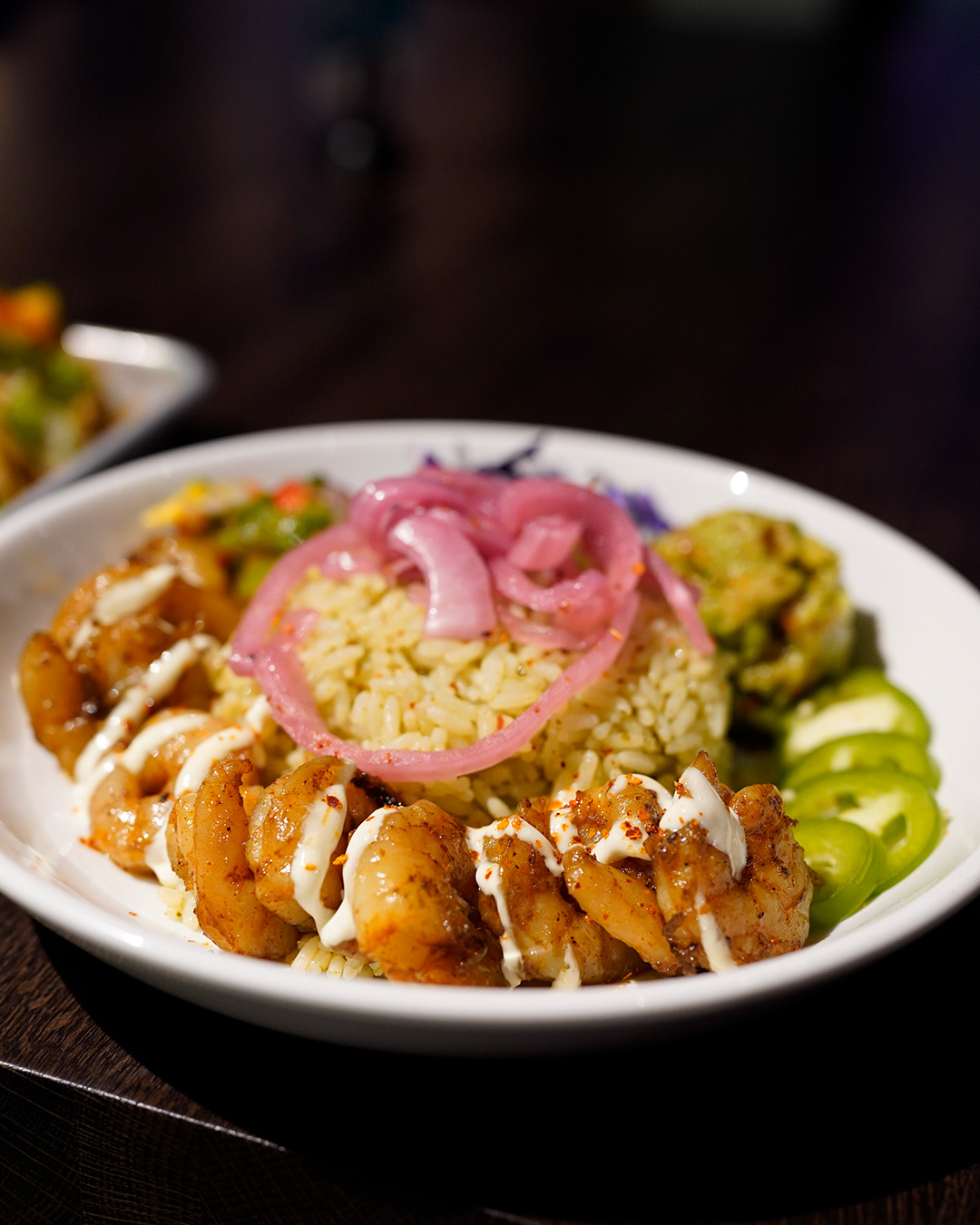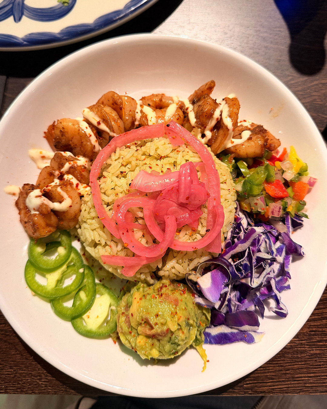 For our main course, we tried the Fiesta Shrimp Bowl, and it completely won us over. The grilled shrimp were perfectly seasoned, resting on cilantro-lime rice with guacamole, jalapeño, pickled red onion, red cabbage, and a tropical pineapple habanero crema. The mix of textures and colors makes every bite exciting — spicy, tangy, sweet, and refreshing all at once.